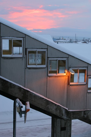 雪雲の間から朝日が昇る