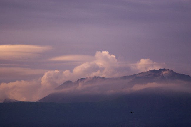 噴火湾に夕陽が落ちる頃、それまで雲に覆われていた有珠が姿を現す。やっぱり晴れ男!と思いきや、以降最終日まで太陽が顔を出すことはありませんでした。(北舟岡駅ホームより300ミリで撮影)