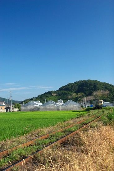 夏の青空と、緑の水田の中を、オールドキハは海辺の旧市外に向います。(御坊−学問)