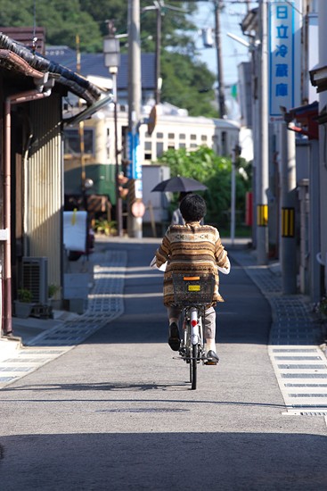 路幅の狭い旧市街。時間が止まったような気分、そんな真夏の昼下がりでした。(市役所前− 西御坊)