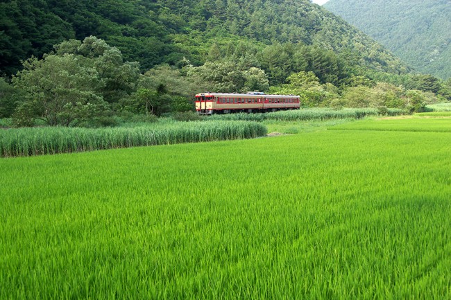 1933D 兄畑 2006.8.5 山間に この日最後に陽射しがあたる中 夕方の大館行きが通過 EOS 20D Canon EF24-105mm F4L IS USM (F4.0 1/400sec. ISO200 f50mm)