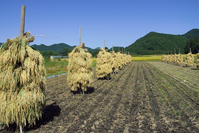 この地方独特のはざがけ。よく見ると気動車がいます。