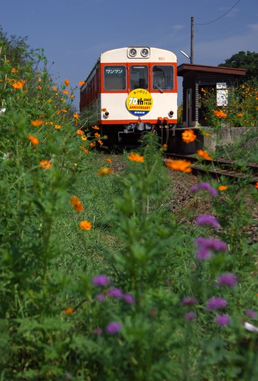 定番ポジションにて。春は桜、初夏はヒルサキツキミソウ、秋深まればコスモスと、花の駅ですね。