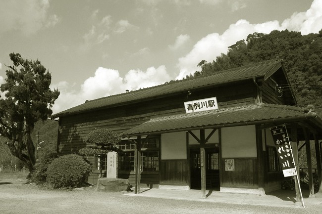 南国らしい常緑樹の林に沿って県道を走り、細い道を下ると、視界が広がり、嘉例川駅に到着