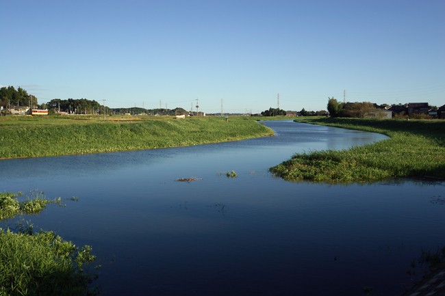 澄み切った青空と S字に蛇行する小川 いい光景でした(600形 小さすぎたかな?!)