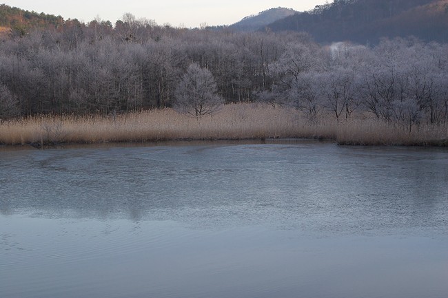 国道の寒暖計はマイナス8度。ゴルフ場の池も「神秘の湖」に変わります。