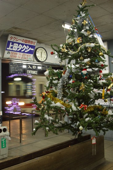 手づくりのツリーが飾られた常陸小川駅。
