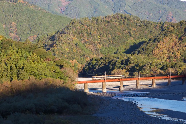 SLの見える丘から。やっと橋梁に朝日があたりました。
