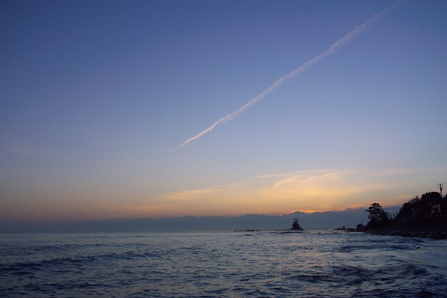 そして、雨晴海岸に出ました。ちょうど満潮のようで、海上から撮っているような雰囲気に。肉眼で見る光景はこんな感じです。これから約30分のマジックアワーの始まり〜
