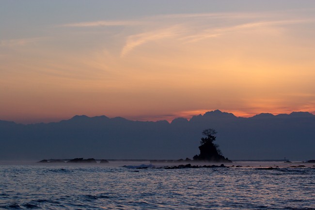 ほぼ同じ時刻に、標準ズームで、義経岩を捉える。ちょうどこの真上あたりに朝日が昇りそうですね。