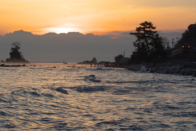 いつもは、「けつ打ち」全然に気しませんが、この時だけは「正面ヘッドライト」でよかったと思いました。立山のシルエットに昇る朝日、おまけに「いい波」も来てくれて、感動の1枚となりました。 (撮影場所:雨晴海岸)