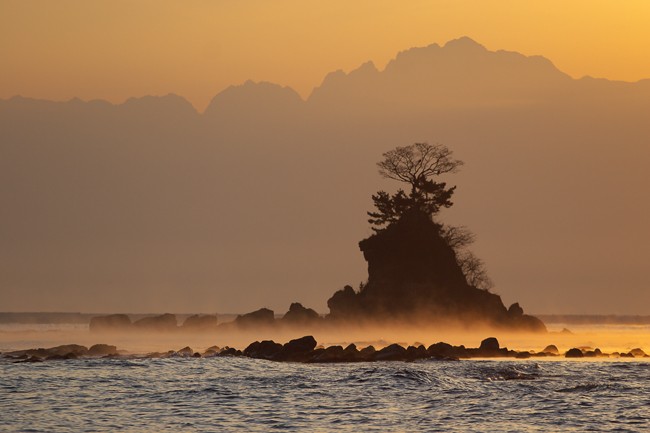 義経岩を200mm(320mm換算)で。こういうシーンに「冬の日本海の厳しさ」感じます。いかにも寒ブリが旨そうな海でした。