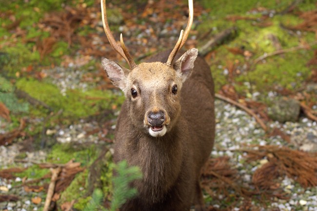 鹿児島県熊毛郡屋久町。厳つい地名とは裏腹に、ヤクシカ君がつぶらな瞳でお出迎え。屋久島は、猿(ヤクザル)2万匹、鹿(ヤクシカ)2万頭、人2万人が、共存しています。