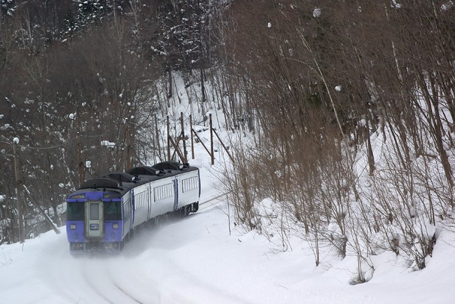 雪煙を上げながら、稚内に向けて快走する特急サロベツ。「雪レ」は美深でこの列車と交換し、こちらに向ってきます。あと30分くらいでしょうか‥。