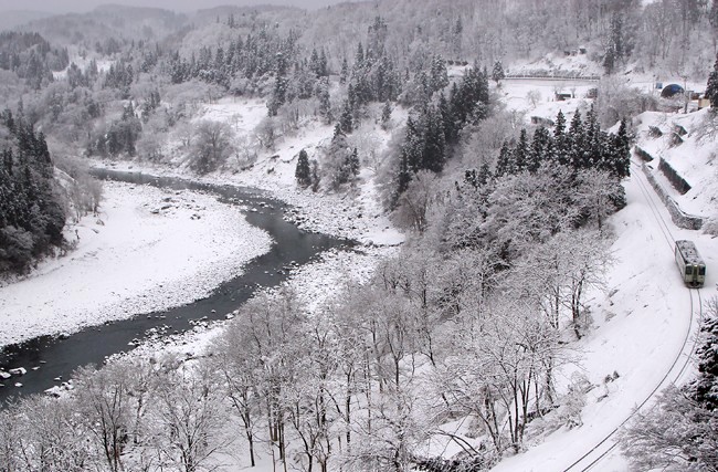 白くなった国道をゆっくり走って、前日ロケハンした森宮野原に到着。薄らですが、降雪直後はいいですね。快晴ならモロ逆光なので、曇り空が返ってよかった。