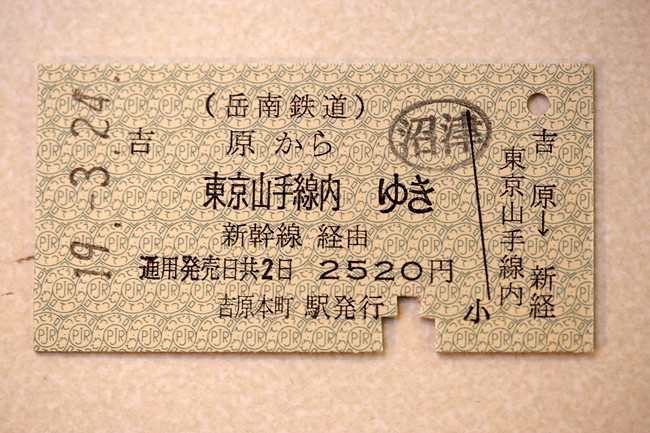 岳南吉原駅で買った 帰りの切符は 何と「硬券」。切符蒐集趣味は無いですが、珍しいので持ち帰りました。 同好の皆さんと沼津で打ち上げ(ゆえに「沼津」の途中下車印)し、帰途につきました。 撮る時間、待つ時間が心地よいこの季節 いい1日でした。 以上「春霞 岳南鉄道」Fin.
