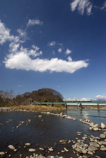 先ほどデハ101を撮影した場所の対岸「富士山下」で下車。渡良瀬川の川原に降りて撮りました。