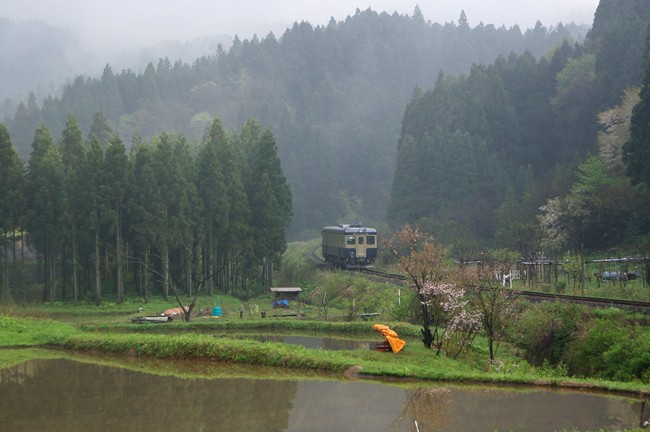 北上するに連れ、山々の新緑は鮮やかになっていきましたが、開花直前の八重桜がある根知の駅撮りでまた雨に降られる‥。雨がなんとも恨めしい! そして、ここ頸城大野に到着した頃、よう やく天気は回復してきました。雨上がりの靄の中、薄日が差し、なかなかいい感じに。