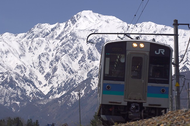 南線に移動すると白馬連峰への距離が縮まり、さらに見事な光景。 遠近感を活用して「太陽に船」、「月に雁」、そして「山に列車」をスッポリ収めて撮りたい。まさに これぞ撮りたかったシーン(国色189が理想、スーパーあずさでもいいのに、それらの大半は白馬止まり‥)。後方の山は唐松岳