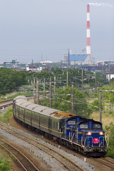 苫小牧の工場群をバックに、トワイライトエクスプレス。