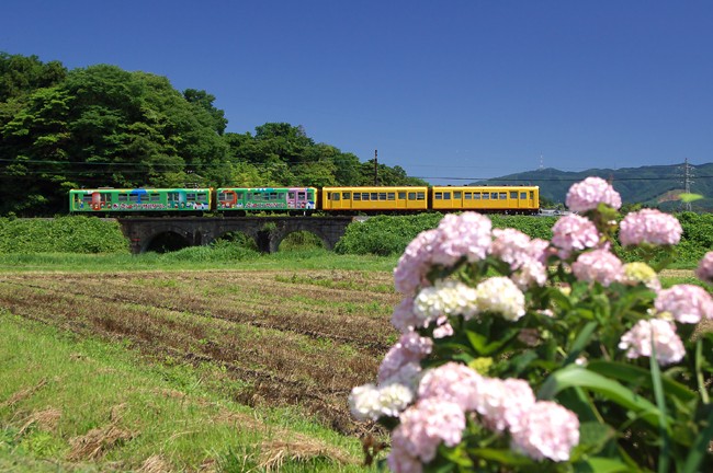 紫陽花の一株が、辛うじてこの季節を表す。それにしてもマッチ箱のような電車が可愛いです。
