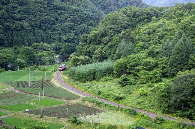 日が落ちた山間の集落。上り列車がゆっくりと茂市へ戻っていった。(しかし、その後「落石」のため、貴重な1往復が運休になってしまった)