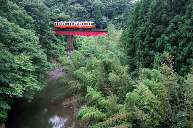 定番、養老川の赤い鉄橋。深い緑とよくマッチ。単行だからうまく収まりました。