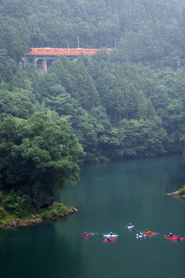 河畔のレストランでしっかり昼食後、再び橋上より。鏡のような川面ではカヌーが浮かぶ。ちょうど201が通過しました