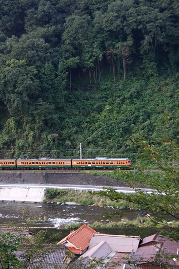 時折、湘南色も走ります。この地らしい石州瓦屋根を入れて。城山公園より。