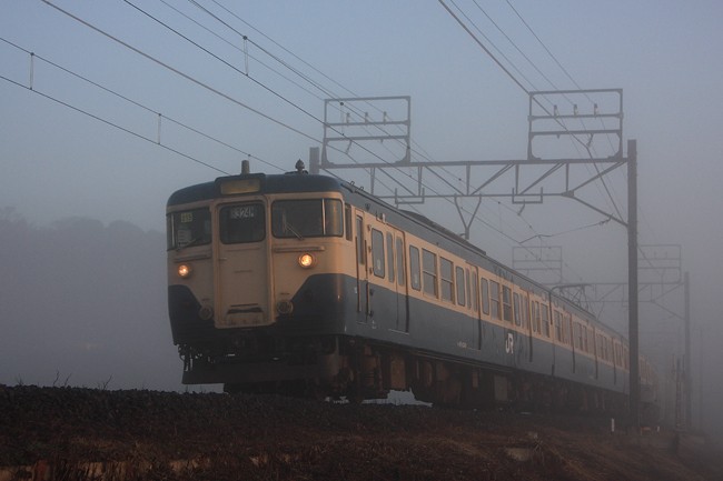 撮影ポイントに向う途中、朝靄の中を、当地の主役、113系スカ色