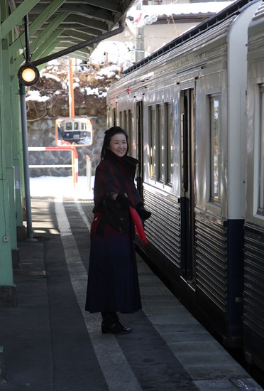 和装の駅長さん。寒い中、笑顔でお見送り、ご苦労さま