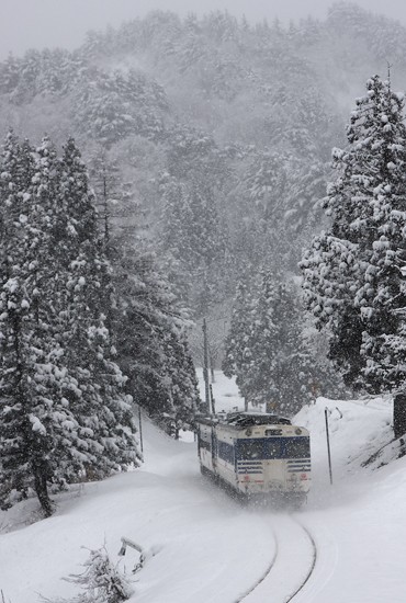 しんしんと降る雪。車も人も疎らな峠道。列車は静かに林間に消えていった。