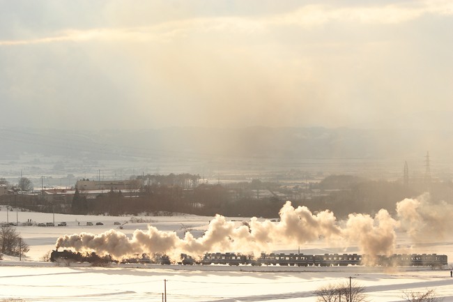 列車通過時には、西日が差して、煙と雪原が輝くという展開。盆地を見下ろす俯瞰場所で、幸せなひとときでした。