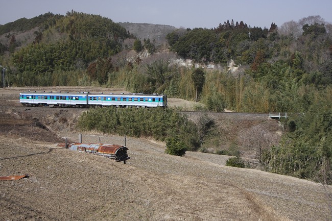 国道に沿って終点方面に20分ほど歩くと、冬枯れの棚田がありました。終点亀山から戻ってきた列車を撮る。春になり、田に水が入ると、いい感じかも。