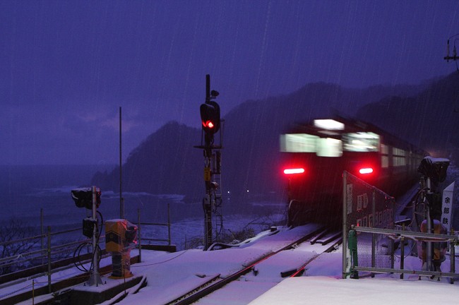 夜明けの色に染まった空と日本海です。次の列車(鳥取発の「はまかぜ2号」)到着まで約20分。空は明るくなるだろうか、雪は止んでくれるだろうかと思いながら、撮影ポイントに登りました。
