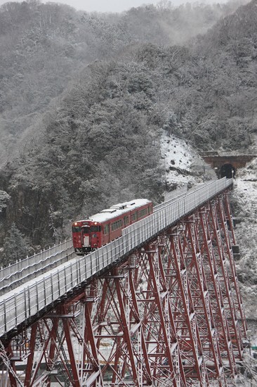 傘が重くなるほどの吹雪でしたが、雪が止むと、景色も一変しました。いいタイミングで浜坂へ向う普通列車がやってきました。