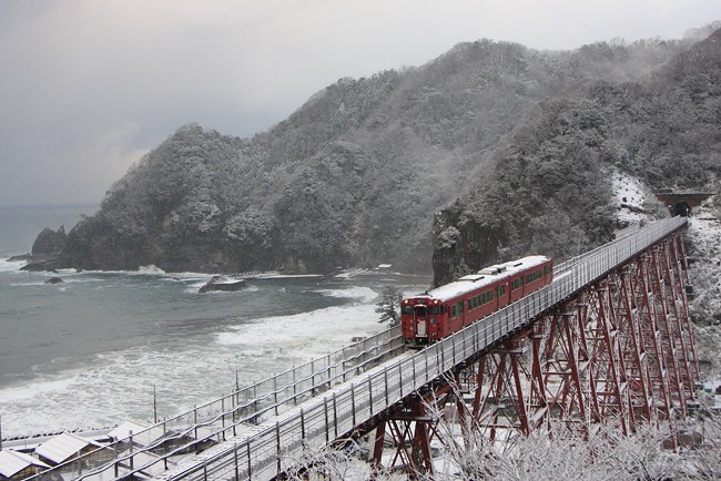 カメラを横に持ち替えて。はまかぜ通過から約1時間。橋梁も対岸もすっかり雪化粧、景色が一変しました。