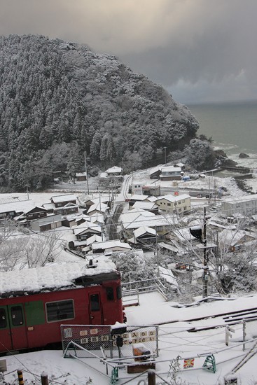 また吹雪になりそうな空模様。次の列車は下から撮ろうと、坂道を降りました。