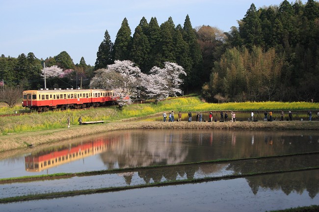お気に入りの場所から。列車通過時に風が止み、駅と桜と車両が水の入った田圃に映りました。お伽のような世界です。