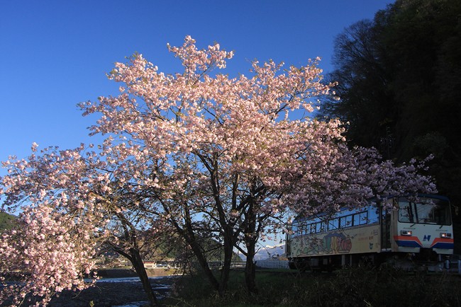 徐々に日が当たり始めた一本桜。あとちょっとのところで列車通過。1号でした。健在だね〜