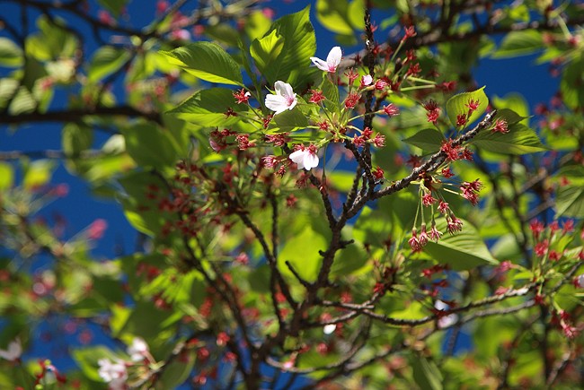 快晴の朝。葉桜相生。花が少しだけ残っていました。