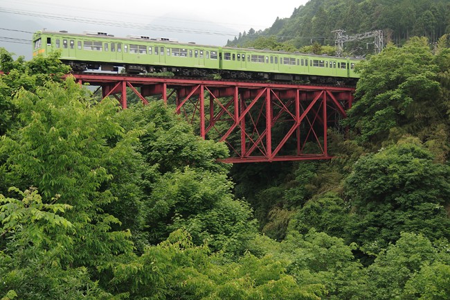 しっとり夏の緑に覆われた小川にかかる鉄橋。保護色のような山手線カラーがゆっくりと通過