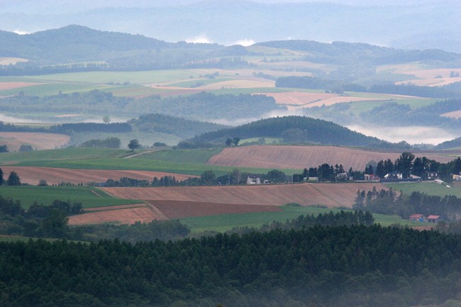 夜が明けて、火山と人々が作ったパッチワークの全景が‥。さて、これから石北貨物へ。忙しい2日目です。