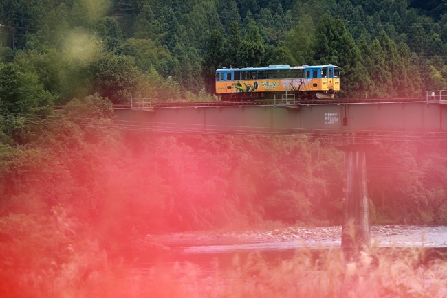 神海の先の根尾川を渡る鉄橋にて。色づいた田圃、彼岸花など、どう撮ったらいいか迷ってしまいましたが、結局望遠で。