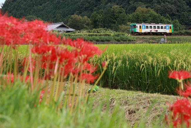 稔りの季節に彼岸花。収穫が関東と比べて遅めの岐阜では、稲穂と彼岸花が同時に見られます。