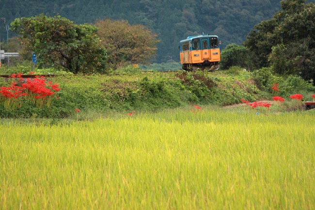 そして、翌朝下り一番列車。 黄金色の田圃と畦を彩る赤。撮りたかった光景です。