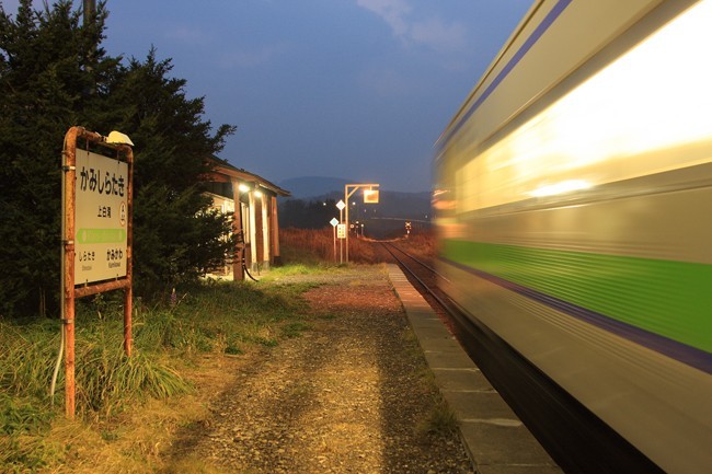 日に上下2本しか停車しない上白滝駅。午後5時過ぎに上り列車が到着。原野にポツンと木造駅舎。いい雰囲気の駅でしたが、犬が煩く吠えるので落ち着いて撮れませんでした。さて、温泉。今夜のお宿、白滝温泉ホテルへ。