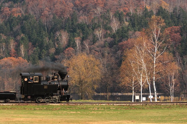 北海道独特の紅葉風景、ダム湖に沿って‥、メルヘンな光景です。