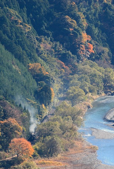 紅葉ピーク、視界良し、水量そこそこありの好条件。途中で車を降りて坂道を登ると、同好の皆さん10名以上。列車が見えてから通過するまでの数分間。俯瞰場所の幸福感です。