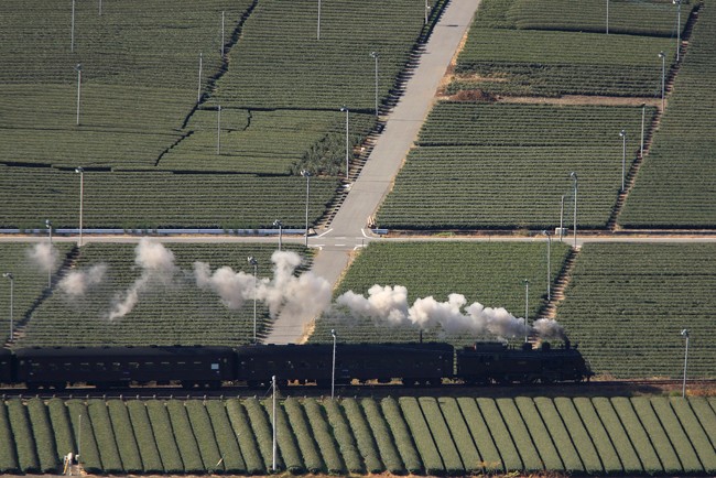 101レ 2008.12.6 うりやさんで昼食後、向った先は笹間渡開墾地。第一橋梁が改修中のため、抜里方面が狙いです。汽車通過まで1時間近くあったため、悩む時間はたっぷり。獅子抜里など3つの撮り方ができましたが、超長玉が無かったので、「抜里駅通過後の築堤登り」を選択。 パッチワークのような茶畑ときれいな白煙、すっきり撮れました。
